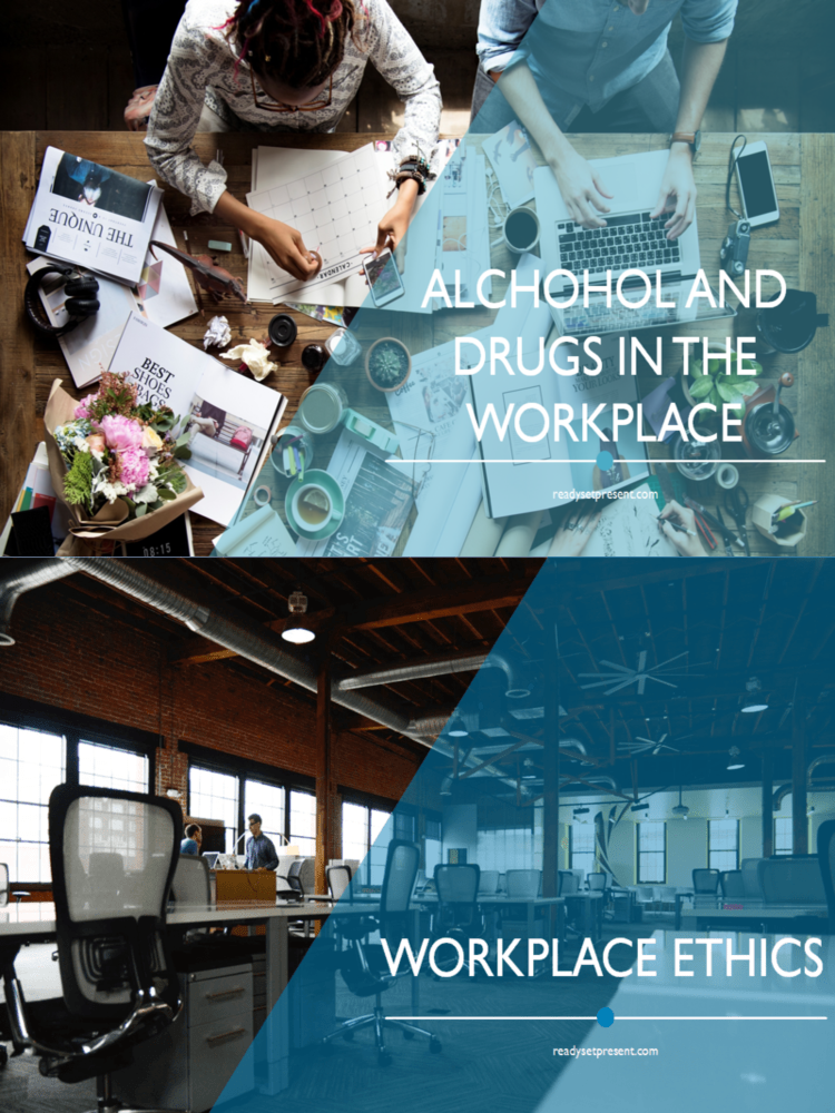Alcohol and Drugs (Modern) PowerPoint Presentation Content - 133 slides: 5 slides on the problem of drugs create in the workplace, 8 slides on how to assess your workplace drug problem, 10 slides on creating a drug-free policy, 17 slides on training supervisors, 13 slides on how to educate employees on substance abuse, 18 slides on Employee Assistance Programs, 22 slides on Drug testing/methods, 9 hallmarks of a successful drug-free program, 7 points on drug abuse in small businesses, 9 steps for safe office celebrations, and much more.