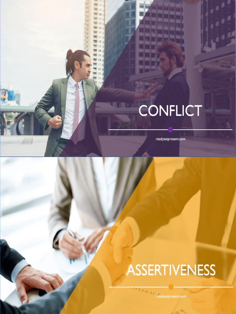 Assertiveness (Modern) PowerPoint Presentation Content - 133 slides: slides helping you recognize, test and evaluate your own assertiveness | statements and assertive rights, 10 points for testing assertiveness, 7 points on testing for aggressiveness, 7 points on testing unassertiveness, 5 case studies on assertiveness, identification of the 6 personality types, slides on assertive do's and don'ts, points on the significance of body language and eye contact, relaxation techniques, 4 tips for coping with conflict, 9 points on defining communication forms, 6 tips on controlling emotions, 8 tips on assertiveness, 16 steps for assertive action, 9 types of assertive responses, points on overcoming fear, 4 steps to saying no, 20+ slides with tips on becoming more assertive, how to's and much more