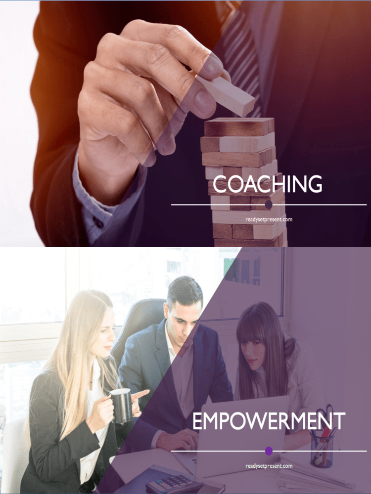 Coaching Skills (Modern) PowerPoint Presentation Content - 129 slides: Includes sslides on the characteristics and skills of coaches, Benefits of coaching, techniques for coaching, slides on the "we need to talk" coaching meeting, slides on dealing with poor performance, avoiding coaching pitfalls, slides on the 6 - step coaching model, a 1 minute guide to praise/reprimands, discussing recurring problems, 20+ slides on modeling coaching behavior, building a coaching atmosphere and assessing your coaching style.